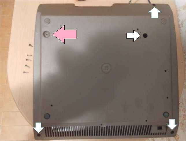 Per poterlo aprire è necessario rivoltarlo. E’ abbastanza facile arrivare al suo interno, basterà con un cacciavite a stella, svitare 5 viti, stando attenti, essendo l’involucro di una plastica molto sottile e fragile. Nella successive due immagini, vengono evidenziati i punti in cui son presenti le viti. Nel luogo contrassegnato in rosso ho trovato una vite leggermente differente. Non so se si tratta di viti originali o meno, non avendo al modello nessun riscontro.