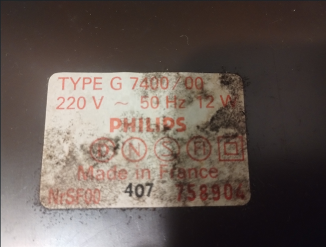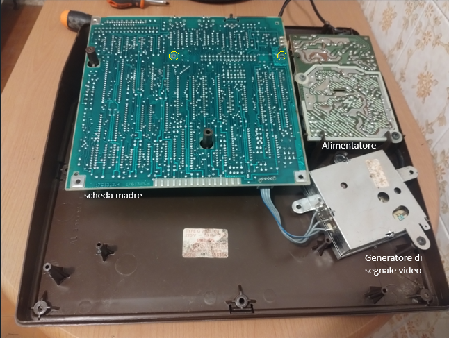 Una volta tolte le 5 viti, la plancia posteriore può essere alzata e messa da parte, e ciò che appare all’interno è : la scheda madre sulla sinistra che occupa gran parte dello spazio, l’alimentatore in alto a destra e il circuito che genera il segnale video, in basso a destra (sotto l’alimentatore). Sull’interno della plancia anteriore, appena sotto la scheda madre è incollata una piccola etichetta bianca, in cui viene riportato il modello e probabilmente revisione (TYPE G7400/00), alimentazione richiesta (220 Volt continia 50Hz *esternamente* quindi in ingresso all’alimentatore, 12 Volt alternata alla scheda madre, dall’uscita dell’alimentatore), produttore (PHILIPS), paese di fabbricazione (Made in FRANCE) ed infine quello che potrebbe essere Lotto e Serial Number (NiSFOD 407 758904).