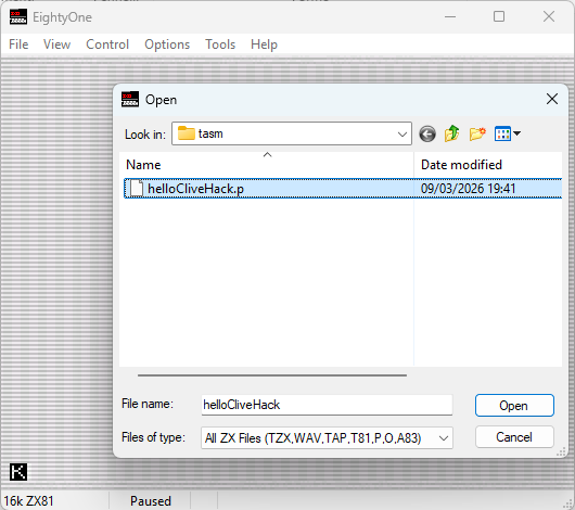 Il file helloClive.P è l’eseguibile per ZX81, che andremo successivamente ad eseguire nell’emulatore.