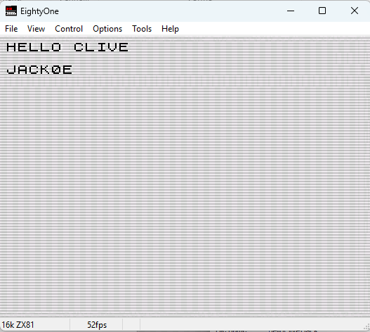 Esecuzione di helloClive su ZX81 (hardware reale)