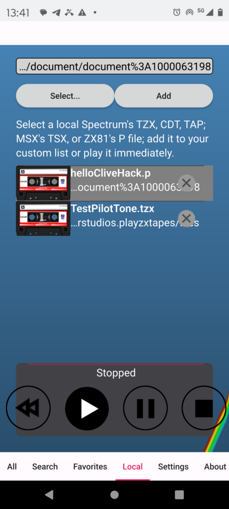 Nella sezione local è possibile selezionare il nostro file helloClive.P e suonarlo tramite il tringolo, che simboleggia il PLAY. Se lo fate sentirete il sonoro del nostro helloWorld, che vi farà riassaporare l’informatica casalinga negli anni 80.